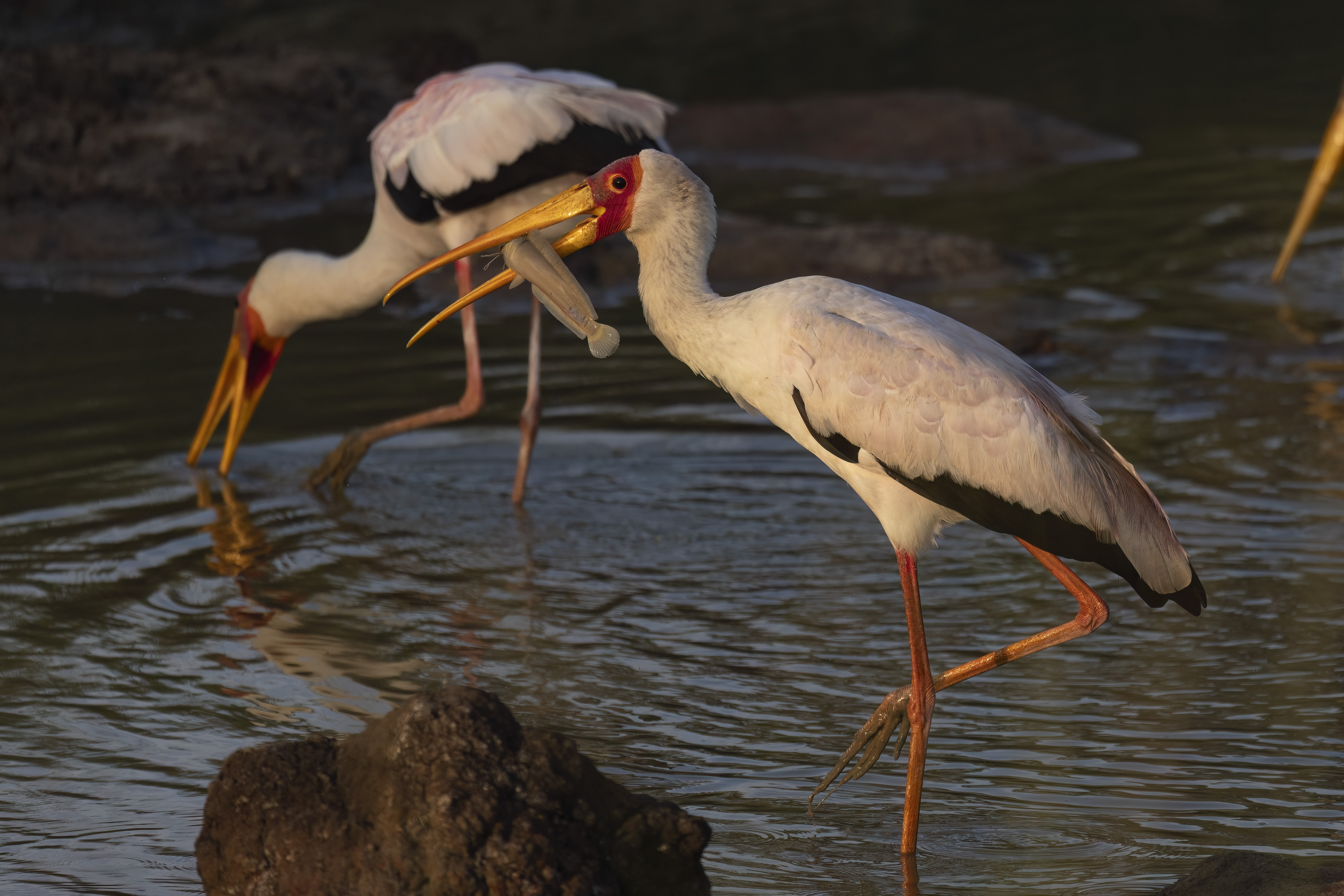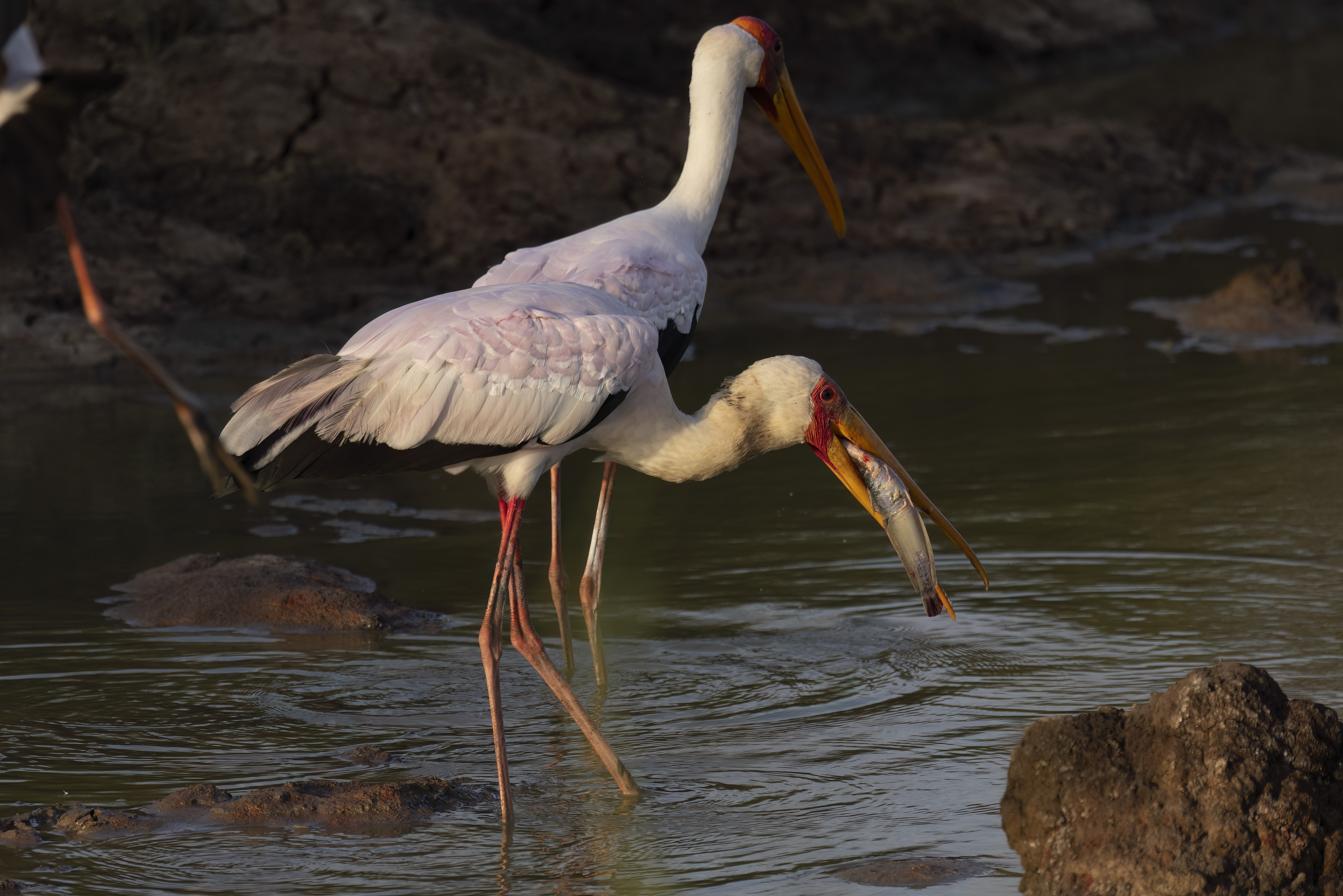 Yellow-billed storks and locals alike fish for catfish in those same muddy pools.
