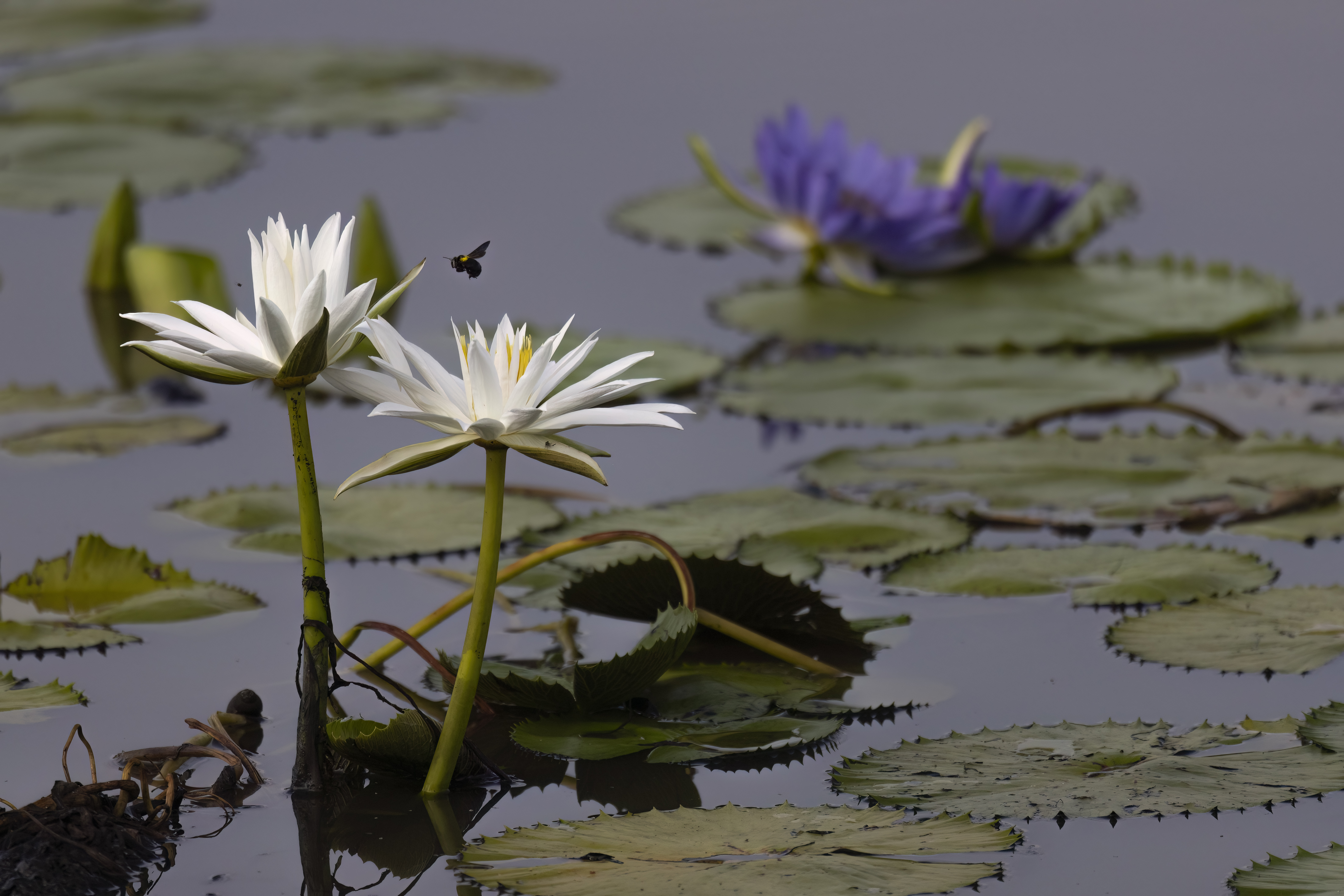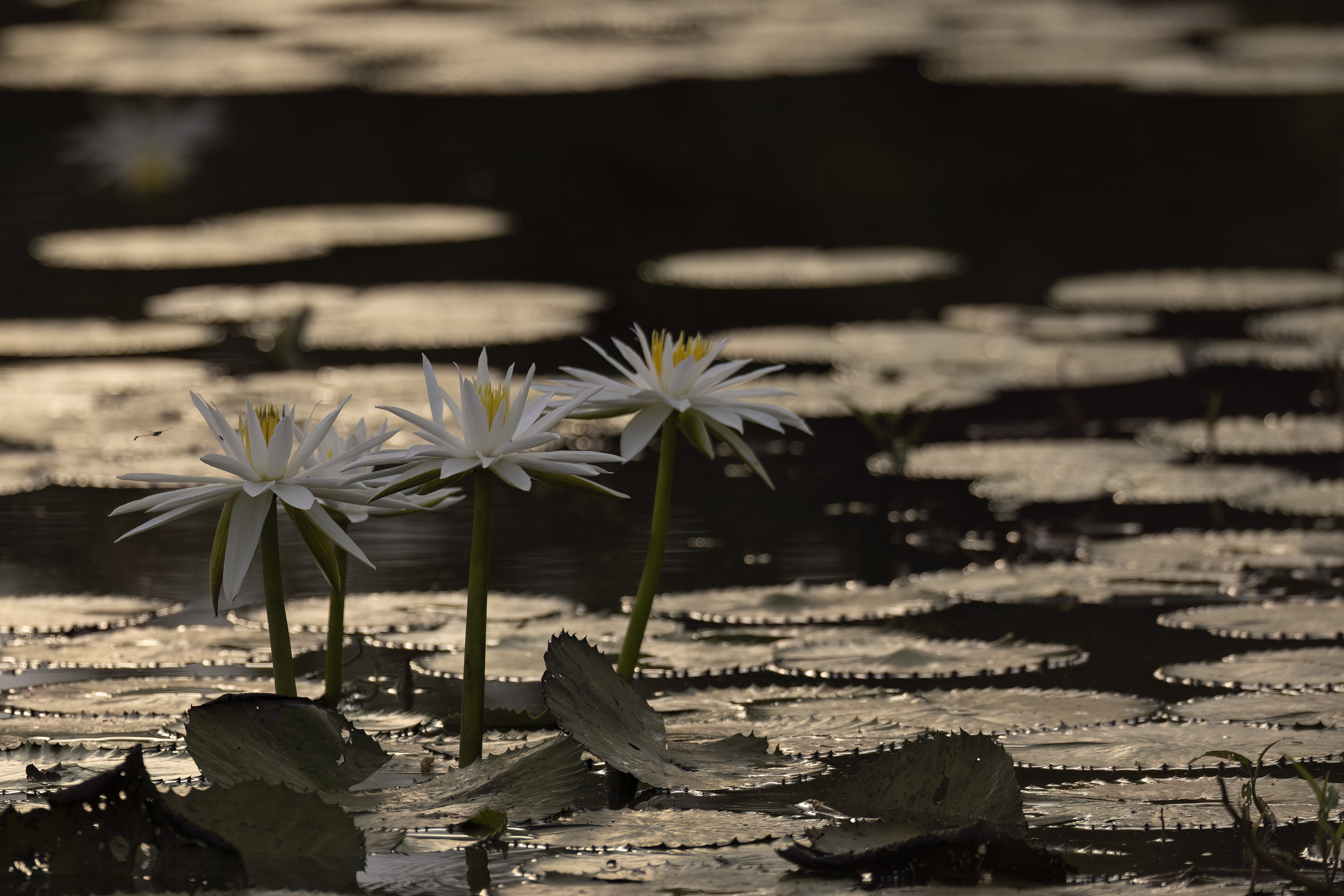 My final photographic subject was the nymphaeas (water lilies). It was spring, and they bloomed in every puddle. I asked Tizo where I could photograph them in peace, and he took me to a small pond at dawn. We parked the car to shield me from the tall grass — where lions might hunt — allowing me to shoot low to the ground. Thankfully, there were no crocodiles, and I could safely capture the flowers in the golden morning light.