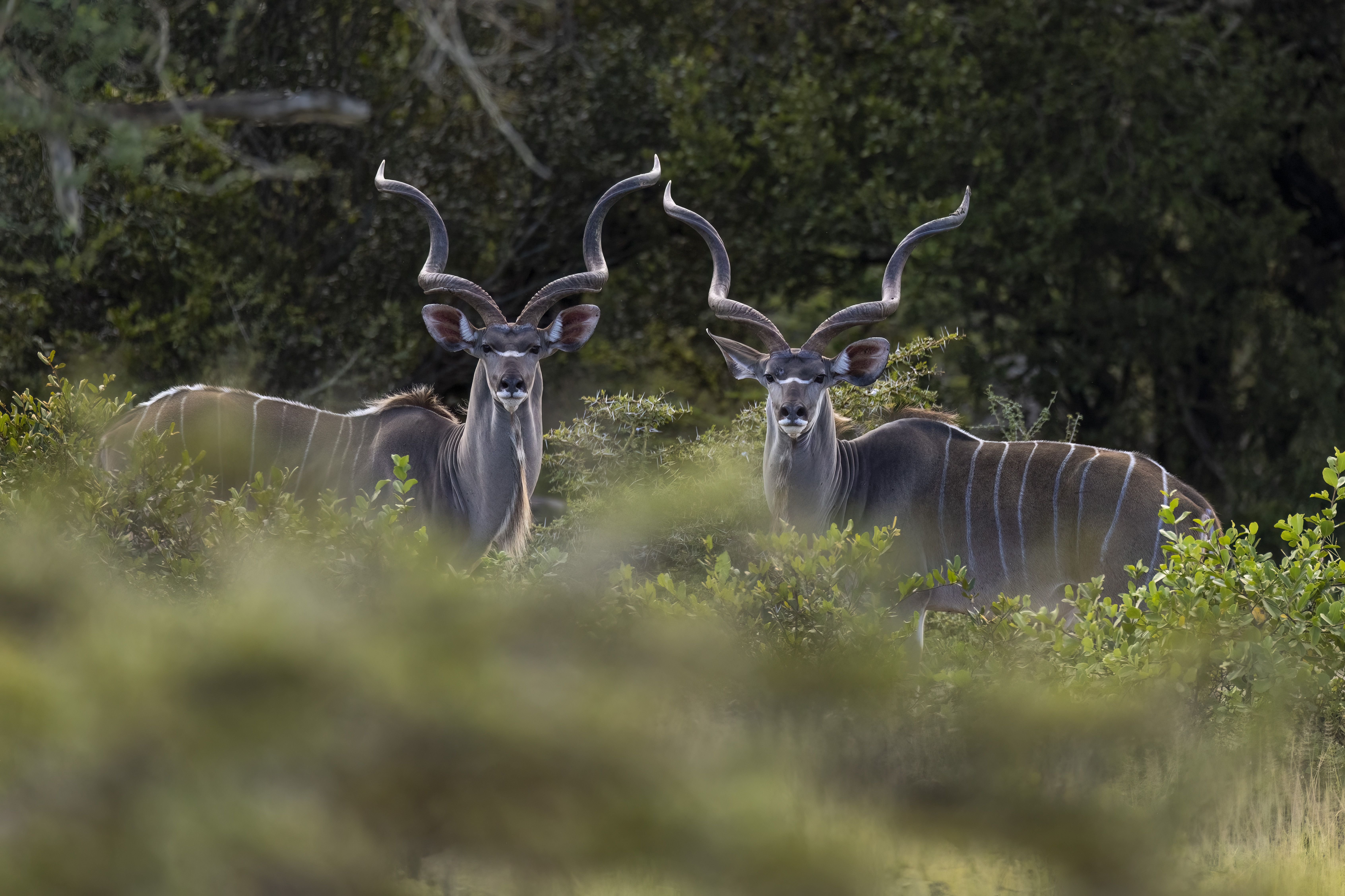 On the way back, luck smiled on us: we encountered three male greater kudus. To me, the greater kudu is among the most beautiful African antelopes — elegant silhouettes, pastel coats, and those magnificent spiraling horns. Females are common in mixed herds, but males are solitary and shy, preferring dense thickets and twilight hours.
