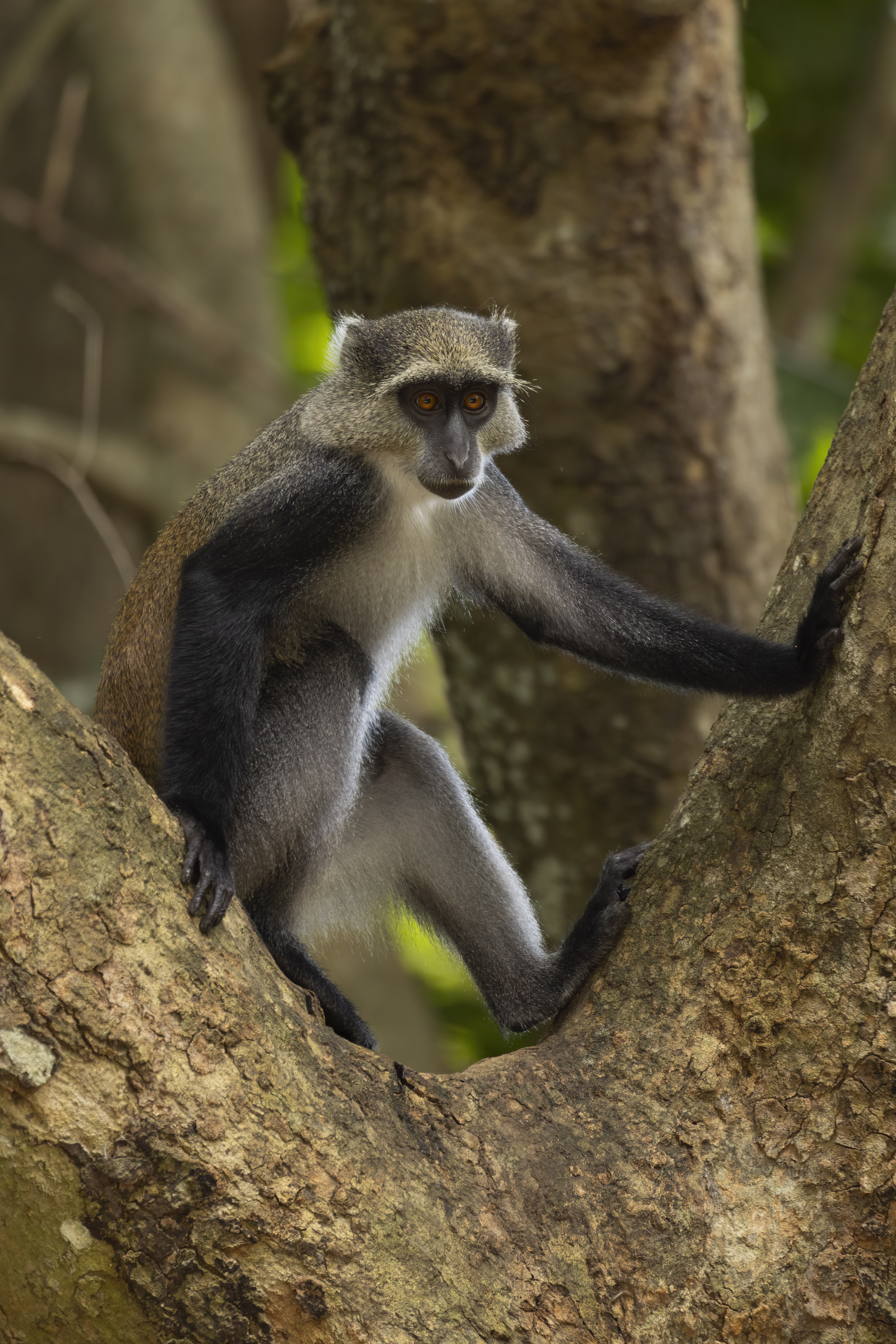 Outside, wildlife was abundant. That first evening, a troop of blue monkeys (Sykes’ monkeys) appeared, and a mongoose darted by. In the sand, I found tracks of a genet, small antelopes, and baboons. Birds were everywhere. At three in the morning, I discovered I was sharing my roof with a family of galagos (bush babies). They nested in the thick thatching and announced their presence with shrill cries — all night long.