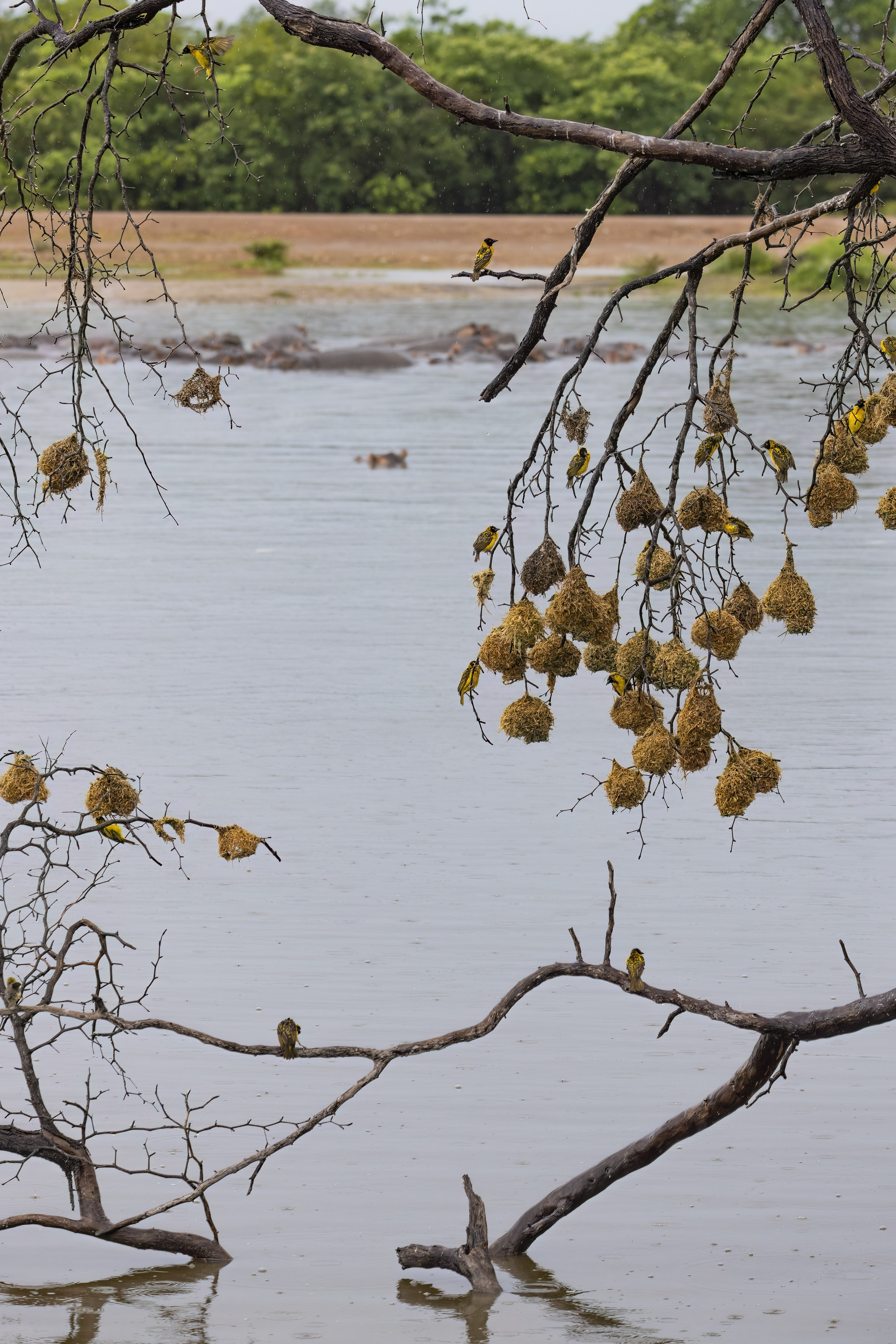 At midday we stopped by a hippo pool clearly dug by machinery — the steep banks still bore the marks of excavator buckets. The hippos didn’t mind; they’d made themselves at home. One gentle slope led toward the road, allowing tourists at the picnic tables a safe vantage point. On dead branches along the shore, a colony of village weavers had built nests.