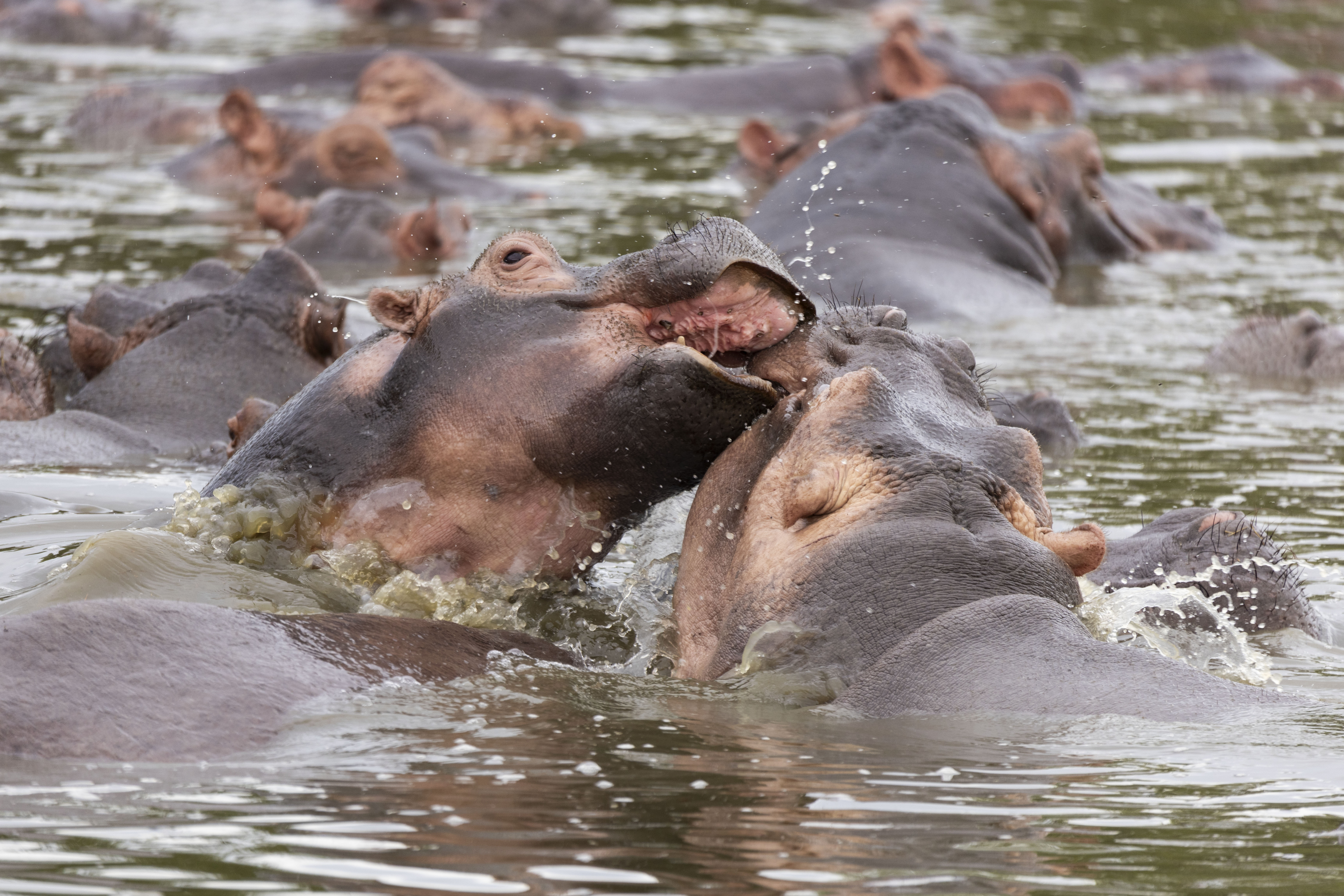 The hippos mostly slept, resting their heads on each other’s backs. Occasionally one yawned or grunted, and once a young hippo drove off a neighbor that had encroached on his living cushion. Hippos dislike rain, the patter of drops irritates their skin, so when showers start, they gallop into the water to hide. In fair weather, though, they can wander kilometers inland, which increases the odds of meeting this very unfriendly animal and getting your butt handed to you.