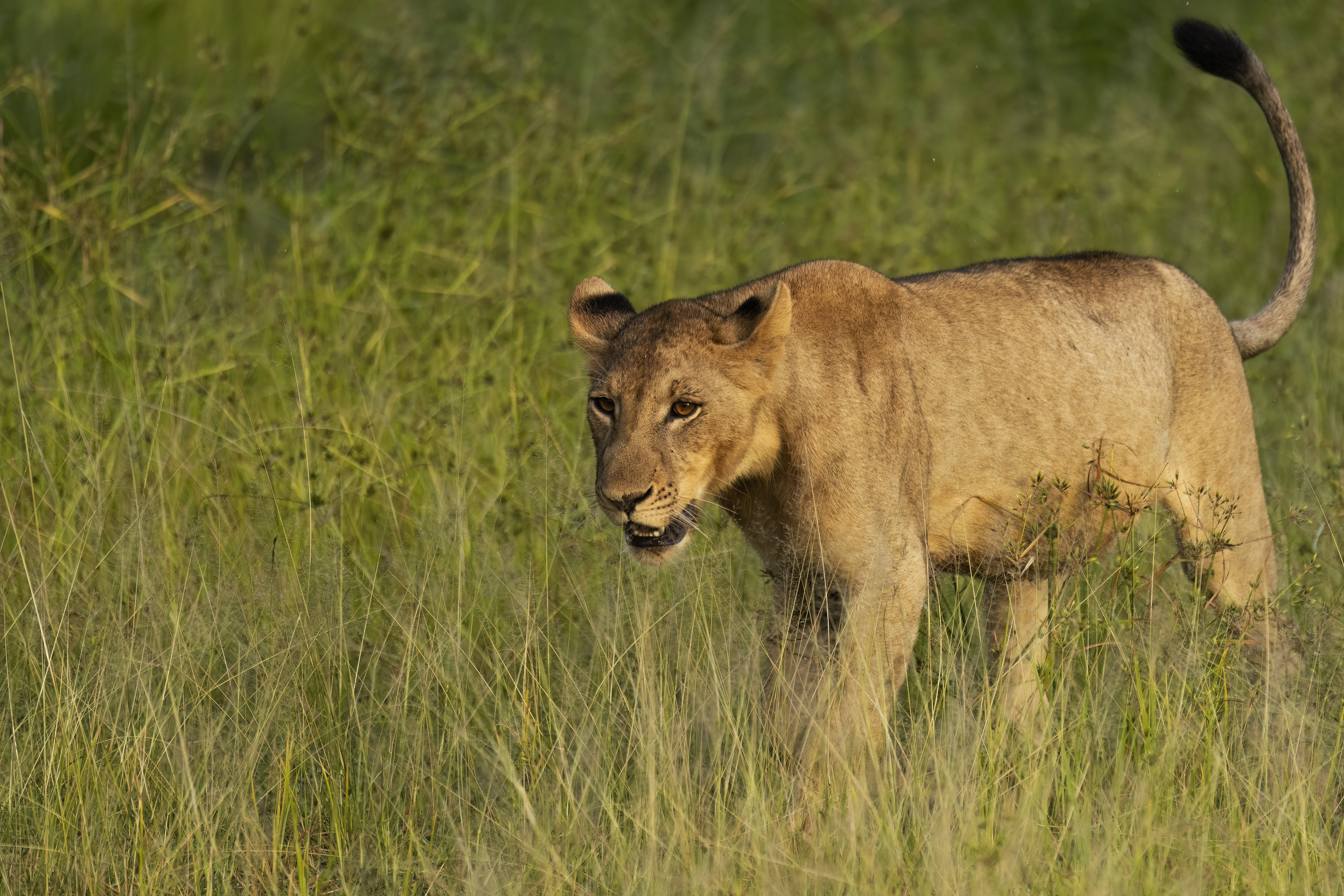 The next morning, we were the first to enter the park and immediately hurried to the spot where the lioness had abandoned the giraffe remains. It turned out the lioness and her two adolescents had already had a snack and weren’t in the mood to pose. She was leading her cubs into the riverside thickets, lashing her flanks with an irritated tail. Good thing we made the effort to get up early, I managed to take a few shots of the cubs in the morning light. They didn’t share their mother’s mood and nuzzled each other — and her — quite calmly.