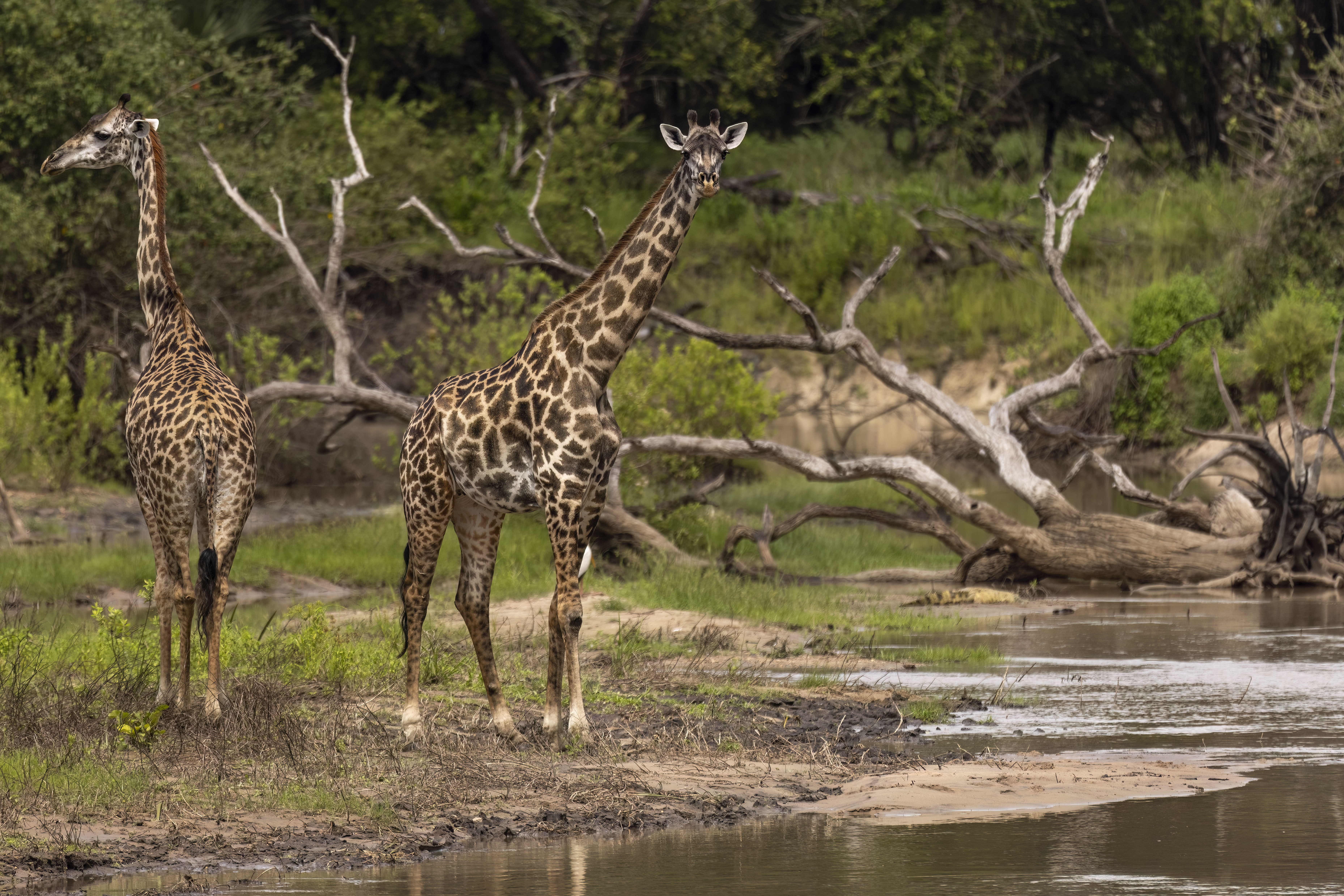 In any case, we moved on — scanning for tracks, sniffing the air, peering and listening. When the hours came when predators settle down for their daytime rest, we turned back to the river. And then we got very lucky. We found a large group of giraffes split by a stream. Part of the herd had waded across; the rest were still deciding what to do. Among the laggards were pregnant females who weren’t eager to step into water where crocodiles were herding fish in the shallows.